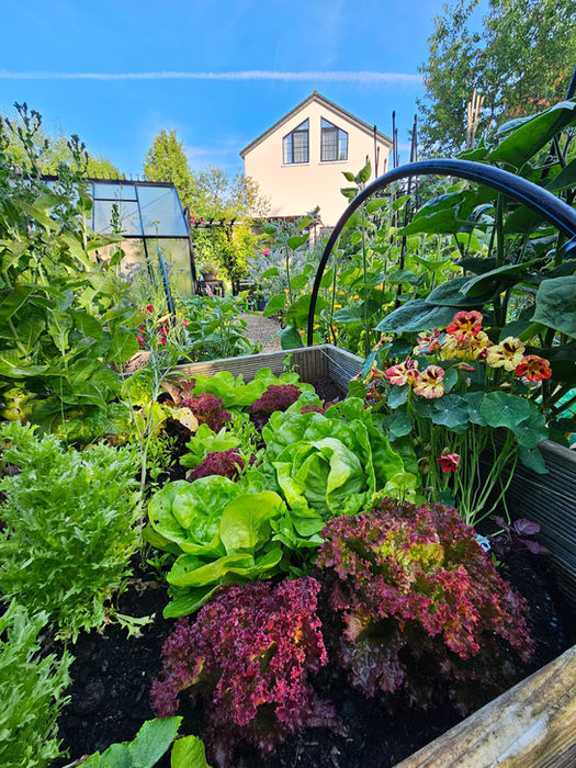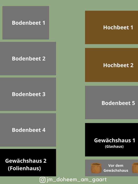 Mit zwei Hochbeeten, fünf Bodenbeeten und zwei Gewächshäusern bieten wir genügend Platz für eine Vielzahl von Gemüsesorten. In den Hochbeeten gedeihen besonders Salate und die frühen Gemüsesorten, die wir im Frühjahr ernten können. Die Bodenbeete ermöglichen uns eine vielfältige Ernte über die gesamte Saison hinweg, von Karotten, Zucchini, Erbsen, Bohnen, Popcornmais bis hin zu Tomaten und Kürbissen.